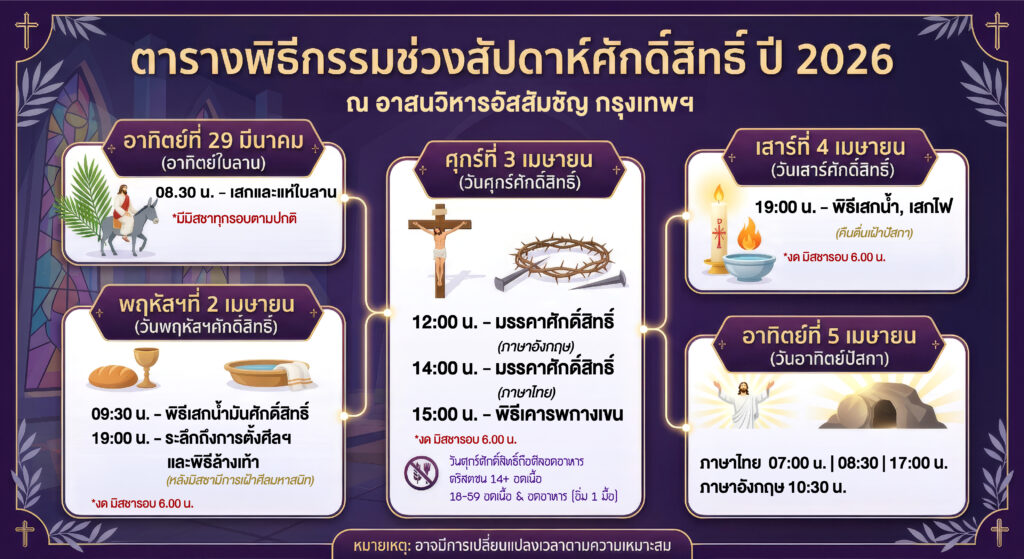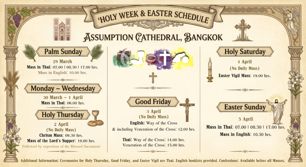 3. กำหนดการเดินรูป 14 ภาค ตลอดเทศกาลมหาพรต วันเสาร์ เวลา 16.30 น. ภาษาไทย(งดการสวดสายประคำ) วันอาทิตย์ เวลา 11.30 น. ภาษาอังกฤษ และ เวลา 16.30 น. ภาษาไทย