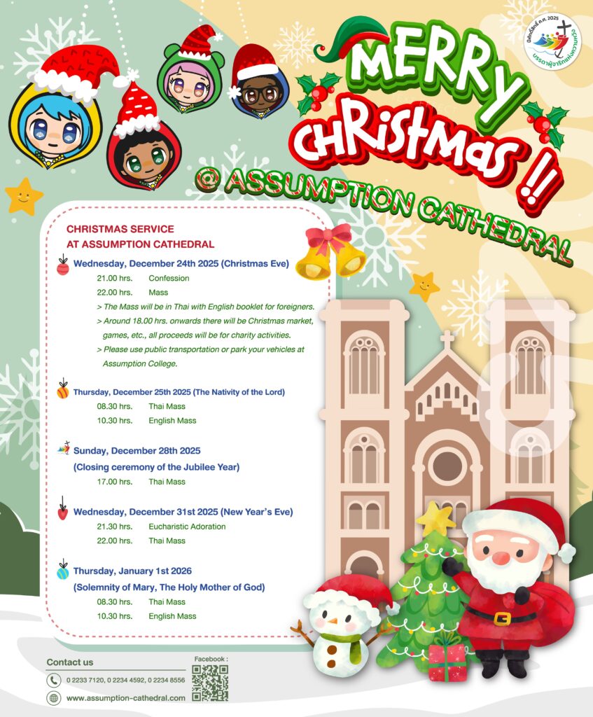3. สภาประมุขบาทหลวงโรมันคาทอลิกแห่งประเทศไทย ขอเรียนเชิญพี่น้องสัตบุรุษทุกท่าน ร่วมในพิธีบูชาขอบพระคุณถวายเป็นพระราชกุศลแด่สมเด็จพระนางเจ้าสิริกิติ์ พระบรมราชินีนาถ พระบรมราชชนนีพันปีหลวง ในนามพระศาสนจักรคาทอลิก วันเสาร์ที่ 13 ธันวาคม ค.ศ. 2025 เวลา 17.00 น. ณ อาสนวิหารอัสสัมชัญ